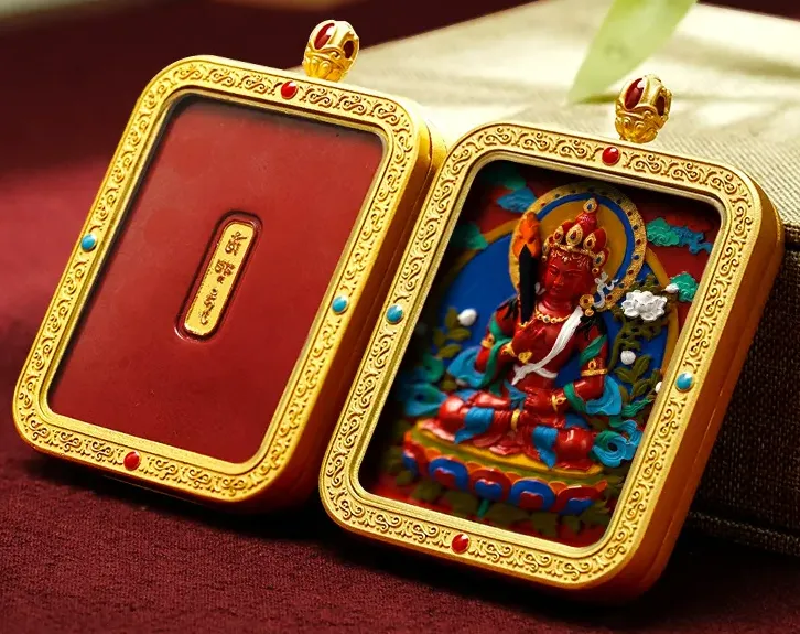 Each pendant features a meticulously hand-painted tsatsa—a traditional Tibetan Buddhist art form. These miniature reliefs depict sacred deities and symbols. The vibrant colors are not merely decorative; they represent the divine and are charged with spiritual significance. - The Sacred Gau: "Gau" translates to "small box" in Tibetan. This portable shrine or amulet is traditionally worn close to the heart. It is believed to offer physical protection and spiritual blessings, helping to purify negative energy and deepen one's meditation practice.